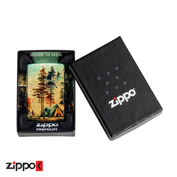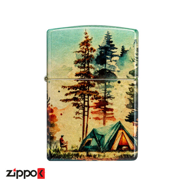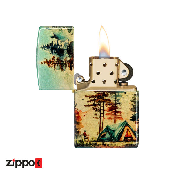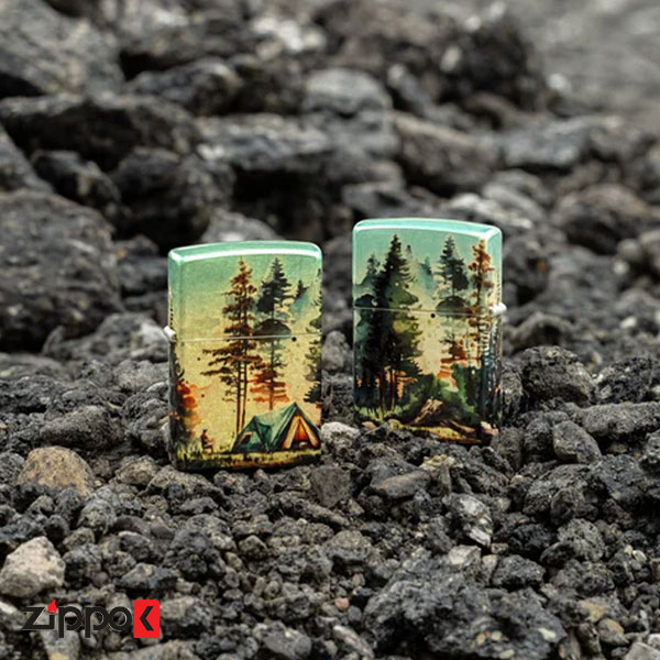 یک اردوگاه دورافتاده، احاطهشده با سروهای سربه فلککشیده، با جزئیات در طراحی سراسری به تصویر کشیده شده است که تُنهای درخشان برنجیِ بدنه فندک را در صحنه آرامشبخش فضای باز ادغام میکند و با استفاده از فرآیندهای 540 Color و Fusion Zippo این طرح زیبا در تمام سطح فندک ایجاد میشود.