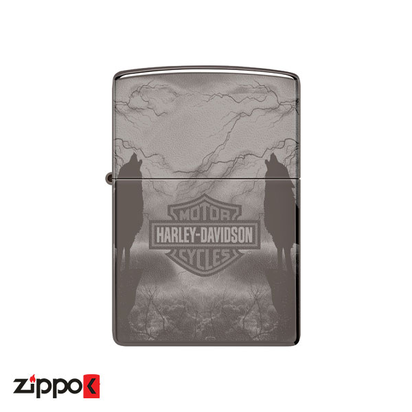 زیپو مدل 48799 طرح لوگوی هارلی دیویدسون و دو گرگ در حال زوزه کشیدن را روی روکش براق بلک آیس (Black Ice) دارد. این تصویر به طور یکپارچه تمام سطح فندک Black Ice را با استفاده از فرآیند Photo Image 360 درجه دور میزند.